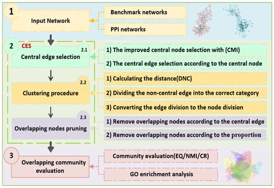 To avoid the shortcomings of CNS, we proposed CES using the information of edges to detect the overlapping communities. The workflow of the CES algorithm shown in Figure 2 contains three major parts, including a procedure of central edge selection, a clustering procedure, and an ONP step. The theory of CMI, introduced in Section 2.3.1, takes into consideration the influence among nodes to make the target central node more reliable. The network can be divided by edges to reduce the difficulty of getting overlapping nodes, and then optimized by ONP.