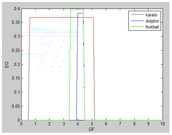 During the procedure of central edge selection, nodenum/edgenum and nodenum/edgenum during the overlapping nodes pruning, where node_num represents the number of nodes in the network and edge_num represents the number of edges in the network. Figure 6 represents the selection of GF, which is based on the value of EQ on the three networks. GF is finally selected as 4.2 × nodenum/edgenum. BCN refers to the number of categories on benchmark networks that are recorded in each publication, and evaluation category number (ECN) represents the number of the category which is produced from the algorithms. The bold numbers are the best values among all algorithms.