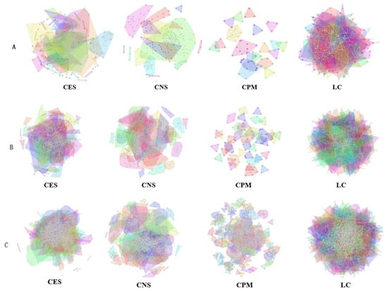 Three PPI networks, from M. musculus, E. coli, and Cerevisiae, were used to test and compare the performance of the four OCD algorithms (CES, CNS, CPM, and LC). The GF values used for each dataset were chosen as 0.9, 0.8, and 0.5, respectively, and 0.1 prop for among the datasets. In each dataset, the CES method showed higher EQ and CR than CNS, CPM, and LC (Table 5). The categories found by CES in the three datasets covered all nodes (proteins) in the population, while CNS only covered 65%, 72%, and 55%, respectively, LC only covered 78%, 60%, and 92%, respectively, and the CPM covered less. Table 5 displays all categories found by the four algorithms. The LC results show much more overlap among categories in each dataset, which induced higher network redundancy, and thus, is far away from the actual protein network structures. The visualization of the predicted PPI network using four algorithms can been seen from Figure 7.