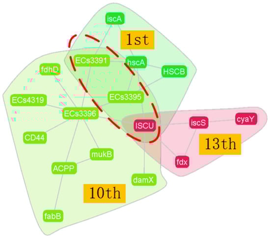 Two categories predicted by the CES algorithm, No. 3 in M. musculus and No. 1 in the E. coli dataset, were selected to showcase the investigation of the relationships among categories and overlapped nodes. For the No.1 significant category in E. coli, six proteins, iscA, ECs3391, ECs3395, HSCB, hscA, and ISCU, were included. Protein hscA, responsible for the transfer of iron-sulfur clusters, was considered as the central node and contributed to the enriched category function. The No. 1 category was found to overlap with the 10th and 13th categories, and shared a common overlapping protein, ISCU, which assembles the Fe-S clusters. The 1st and 10th categories overlapped at two more protein positions, ECs3391 and ECs3395, other than ISCU. ECs3391 is an iron-sulfur protein that helps the assembly of Fe-S clusters, and ECs3395 is a scaffold protein that works with ISCU in the formation of Fe-S clusters. The overall relationships of the three categories are shown in Figure 8. The individual protein functions can be found in Supplementary Table S2, along with the overlapping investigation in M. musculus.