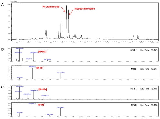 Ion chromatogram of HBX-5. (A) Total ion chromatogram and (B) MS spectra of psoralenoside (C) isopsoralenoside in HBX-5.