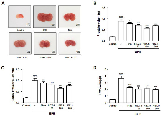 Ten-week-old male Sprague-Dawley rats (200 ± 50 g) were purchased from Daehan Biolink Co. (Daejeon, Korea). The animals were housed under conditions in accordance with the guidelines for the care and use of laboratory animals, which were adopted and promulgated by Sangji University according to the requirements established by the National Institutes of Health. All the experimental protocols were approved by the Institutional Animal Care and Use Committee (IACUC) of Sangji University prior to the initiation of any experimental study (IACUC Animal approval protocol #2016-14). The rats were acclimatized to the laboratory conditions for 1 week, prior to initiating the experiment. BPH was induced in the rats by intramuscular injections of testosterone propionate after castration. Briefly, rats were divided into six groups: Group 1—control group (Control, normal prostate with vehicle: 200 μL corn oil; subcutaneous injection (s.c.)); Group 2—rats with BPH group (BPH); Group 3—rats with BPH group treated with 5 mg/kg/day of finasteride; Per os (p.o.) (Fina); Group 4—rats with BPH group treated with 50 mg/kg/day of HBX-5; p.o. (HBX-5 50); Group 5—rats with BPH group treated with 100 mg/kg/day of HBX-5; p.o. (HBX-5 100); Group 6—rats with BPH group treated with 200 mg/kg/day of HBX-5; p.o. (HBX-5 200). rats with BPH groups were injected with testosterone propionate (10 mg/kg/day) alone or along with HBX-5 or finasteride for four weeks except weekends. After 24 h of the last administration, all rats were sacrificed after anaesthetization with zoletil 50 (i.p., 20 mg/kg). Blood samples were drawn from the caudal vena cava and the serum was separated by centrifugation at 4 °C and stored at −80 °C. The entire prostate gland was removed and weighed.