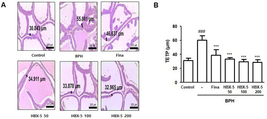 Effect of HBX-5 on the prostatic cell proliferation. (A) Hematoxylin and eosin staining of prostate tissue from rats with BPH models; original magnification 40×. (B) Thickness of prostatic epithelial tissue. TETP was measured and expressed as the mean ± standard error of 5 rats per group. TETP was quantified at three section per sample. Values are the mean ± SD (n = 10); ### p < 0.001 vs. Control group; *** p < 0.001 vs. BPH group. significances between treated groups were determined using ANOVA and Dunnett’s post hoc test. Control, Control group; BPH, rats with BPH group; Fina, rats with BPH group treated with 5 mg/kg/day of finasteride; HBX-5 50, rats with BPH group treated with 50 mg/kg/day of HBX-5; HBX-5 100, rats with BPH group treated with 100 mg/kg/day of HBX-5; HBX-5 200, rats with BPH group treated with 200 mg/kg/day of HBX-5.