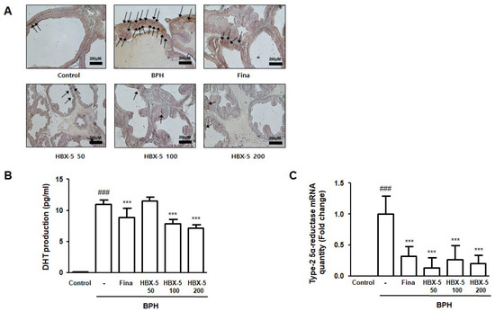 Effect of HBX-5 administration on the expression of AR and level of 5α-reductase 2 mRNA and production of DHT in rats with BPH. (A) The manifestation of AR in prostate tissues was performed by IHC. The arrows indicate immunoreactivity of AR in the representative pictures of each group. (B) Serum concentration of DHT was determined by ELISA. (C) Expression of 5α-reductase 2 mRNA in prostate tissues was analyzed by quantitative real-time PCR. Values are the mean ± SD (n = 10); ### p < 0.001 vs. Control group; *** p < 0.001 vs. BPH group. significances between treated groups were determined using ANOVA and Dunnett’s post hoc test. Control, Control group; BPH, rats with BPH group; Fina, rats with BPH group treated with 5 mg/kg/day of finasteride; HBX-5 50, rats with BPH group treated with 50 mg/kg/day of HBX-5; HBX-5 100, rats with BPH group treated with 100 mg/kg/day of HBX-5; HBX-5 200, rats with BPH group treated with 200 mg/kg/day of HBX-5.