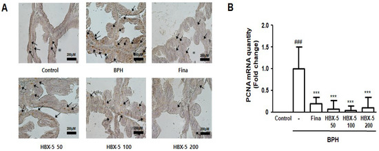 Effect of HBX-5 administration on the expression of PCNA. (A) The manifestation of PCNA in prostate tissues was performed by IHC staining. The arrows indicate immunoreactivity of PCNA in the representative pictures of each group. (B) Expression of mRNA for PCNA in prostate tissues was analyzed by quantitative real-time PCR. The data presented as the mean ± standard error of the mean of 10 rats per group (### p < 0.001 vs. Con group; *** p < 0.001 vs. BPH group). Control, Control group; BPH, rats with BPH group; Fina, rats with BPH group treated with 5 mg/kg/day of finasteride; HBX-5 50, rats with BPH group treated with 50 mg/kg/day of HBX-5; HBX-5 100, rats with BPH group treated with 100 mg/kg/day of HBX-5; HBX-5 200, rats with BPH group treated with 200 mg/kg/day of HBX-5.