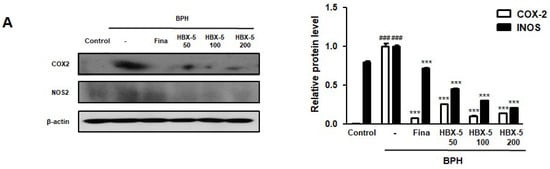 Effect of HBX-5 on the expression of COX-2 and iNOS in prostate tissues of rats with BPH models. (A) The protein levels of COX-2 and iNOS were determined by western blotting using specific antibodies. β-actin was used as an internal control. (B) Densitometric analysis was performed using ImageJ Software. The data presented as the mean ± standard error of the mean of 10 rats per group (### p < 0.001 vs. Control group; *** p < 0.001 vs. BPH group). Control, Control group; BPH, rats with BPH group; Fina, rats with BPH group treated with 5 mg/kg/day of finasteride; HBX-5 50, rats with BPH group treated with 50 mg/kg/day of HBX-5; HBX-5 100, rats with BPH group treated with 100 mg/kg/day of HBX-5; HBX-5 200, rats with BPH group treated with 200 mg/kg/day of HBX-5.