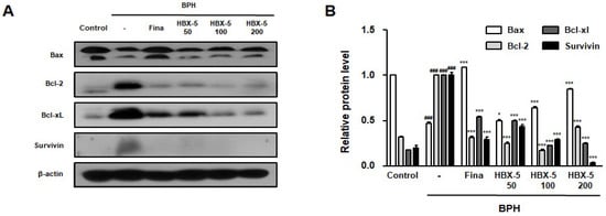 It has been argued that the potential involvement of anti-apoptosis proteins in growth imbalance ultimately promotes prostate hypertrophy. Previous studies have reported that increased expression of Bcl-2, a potent apoptosis suppressor, was detected in BPH specimens in comparison to normal prostate specimens [20]. The results of this study corroborated with the findings of previous studies, which depicted that testosterone-induced BPH might be associated with the alterations in the Bax-to-Bcl-2 balance [23]. In Figure 8, HBX-5- and finasteride-treated groups showed decreased expression of Bcl-2, Bcl-xL, and Survivin; and increased expression of the pro-apoptotic protein, Bax. These findings suggest that HBX-5-induced apoptosis plays a critical role in the alleviation of BPH.