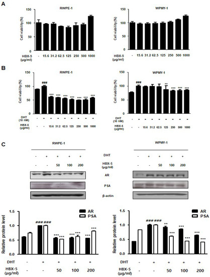 The normal human prostatic epithelial cell line RWPE-1 and normal human prostatic stromal cell WPMY-1 were obtained from the American Type Culture Collection (Manassas, VA, USA). RWPE-1 cells were cultured in Keratinocyte Serum Free Medium (K-SFM), supplemented with 0.05 mg/mL bovine pituitary extract (BPE), 5 ng/mL human recombinant epidermal growth factor (EGF) and antibiotic-antimycotic (Gibco, Big Cabin, OK, USA). WPMY-1 cells were cultured in Dulbecco’s Modified Eagle’s Medium (DMEM), supplemented with 1% penicillin/streptomycin and 10% FBS (Gibco, Big Cabin, OK, USA). After 24 h of incubation, the cells were starved for 24 h prior to some of the experiments. Then, the cells were treated with 10 nM DHT for 24–72 h, with or without various concentrations of HBX-5 (50–200 μg/mL).