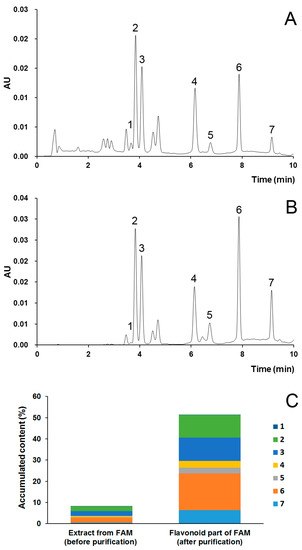 UPLC chromatograms of crude extract from FAM (before purification, (A)) and flavonoid part of FAM (after purification, (B ), and the accumulated content of the seven main flavonoids (C). 1. Rutin, 2. Hyperoside, 3. Isoquercetin, 4. Hibifolin, 5. Myricetin, 6. Quercetin-3′-O-glucoside, 7. Quercetin.