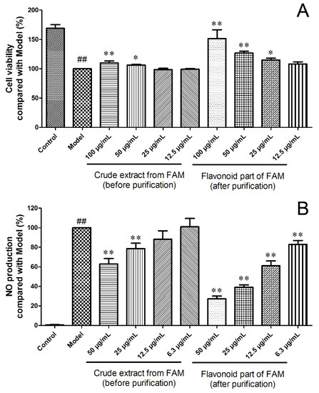 An increased number of macrophages are found in a diseased kidney, which plays an important role in inflammation and renal injury in various acute and chronic kidney diseases [22]. The reduction of inflammation is regarded as an effective therapeutic strategy against renal injury [23]. Nitric oxide (NO), as an important inflammatory mediator, is released by activated macrophages [24,25]. The NO production in LPS-stimulated Raw 264.7 cells was determined to compare the anti-inflammatory effects before and after purification at concentrations with no cytotoxicity. As shown in Figure 4B, the NO amount in the model group increased significantly compared to the control group. Raw 264.7 cells were activated by LPS and treated with extract from FAM before or after purification. In both treatments, the NO production in LPS-stimulated Raw 264.7 cells decreased in concentration-dependent manners. The extract from FAM before purification showed an anti-inflammatory effect at the concentration from 25 to 50 μg/mL. After purification, the anti-inflammatory effect of the flavonoid part of FAM was greatly enhanced, exhibiting significant anti-inflammatory effects with concentrations above 6.3 μg/mL. The flavonoid part of FAM at a concentration of 6.3 μg/mL presented a similar anti-inflammatory effect to the extract before purification at 25 μg/mL for this cell model. The main constituents responsible for the anti-inflammatory effects were enriched through the purification process. Further cellular and animal experiments are needed to confirm these effects.