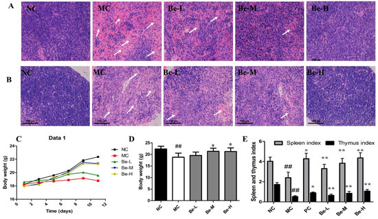 Effects of bergenin on spleen and thymus tissues in Cy-treated mice. (A) Spleen tissues in the HE stained histopathological images (objective: 100×). (B) Thymus tissues in the HE stained histopathological images (objective: 100×). (C) Body weights during treatment. (D) Body weights after treatment. (E) Immune organ indices. NC: normal control group, dosed with saline; MC: model control group, treated with cyclophosphamide; Be-L: challenged with Cy and treated with 5 mg/kg/day bergenin; Be-M: challenged with Cy and treated with 10 mg/kg/day bergenin; Be-H: challenged with Cy and treated with 20 mg/kg/day bergenin. Data are expressed as mean ± SD (n = 8). ## p < 0.01 vs. the NC group, * p < 0.05 and ** p < 0.01 vs. the MC group.