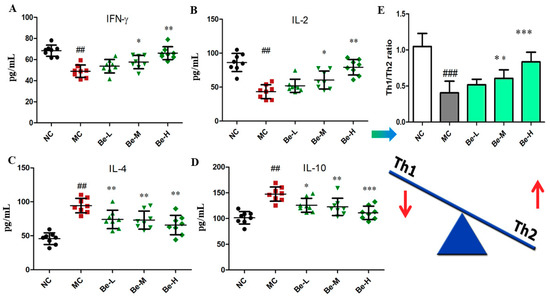 Effect of bergenin on cytokines in the Cy-treated mice serum. (A) Serum IFN-γ levels; (B) Serum IL-2 levels; (C) Serum IL-4 levels; (D) Serum IL-10 levels; (E) Th1 and Th2 cytokine ratio. NC: normal control group, dosed with saline; MC: model control group, challenged with cyclophosphamide; Be-L: challenged with Cy and treated with 5 mg/kg/day bergenin; Be-M: challenged with Cy and treated with 10 mg/kg/day bergenin; Be-H: challenged with Cy and treated with 20 mg/kg/day bergenin. Data are expressed as mean ± SD (n = 8). ## p < 0.01 and ### p < 0.001 vs. the NC group, * p < 0.05, ** p < 0.01 and *** p < 0.001 vs. the MC group.