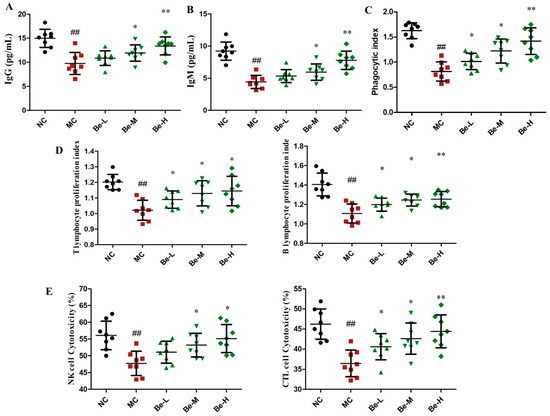 Effect of bergenin on immunoglobulin levels and immune cell activity in the Cy-treated mice. (A) Serum IgG levels; (B) Serum IgM levels; (C) Peritoneal macrophage phagocytosis; (D) Splenocyte proliferation induced by Con A and LPS; (E) Splenic NK and CTL cytotoxic activities. NC: normal control group, dosed with saline; MC: model control group, challenged with cyclophosphamide; Be-L: challenged with Cy and treated with 5 mg/kg/day bergenin; Be-M: challenged with Cy and treated with 10 mg/kg/day bergenin; Be-H: challenged with Cy and treated with 20 mg/kg/day bergenin. Data are expressed as mean ± SD (n = 8). ## p < 0.01 vs. the NC group, * p < 0.05 and ** p < 0.01 vs. the MC group.
