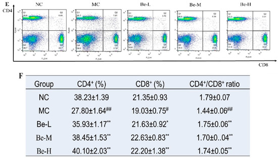 The spleen lymphocytes were prepared and adjusted to 1 × 107/mL and incubated with anti-CD4+ (APC) 0.4 µL and anti-CD8+ (PE) 0.3 µL for 30 min at 4 °C under dark. The spleen lymphocytes were washed for three times with PBS. Then the ratios of CD4+ and CD8+ T lymphocyte subpopulations were analyzed by flow cytometry (Beckman Coulter FC500, Miami, FL, USA).