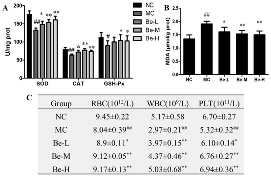Antioxidative activity in spleens and blood cells counts changes after cyclophosphamide injection. (A) Level of SOD, CAT and GSH-Px; (B) Level of MDA; (C) Blood cells counts. NC: normal control group, dosed with saline; MC: model control group, challenged with cyclophosphamide; Be-L: challenged with Cy and treated with 5 mg/kg/day bergenin; Be-M: challenged with Cy and treated with 10 mg/kg/day bergenin; Be-H: challenged with Cy and treated with 20 mg/kg/day bergenin. Values are expressed as mean ± SD, n = 8 mice per group. # p < 0.05, ## p < 0.01 vs. the NC group, * p < 0.05 and ** p < 0.01 vs. the MC group.