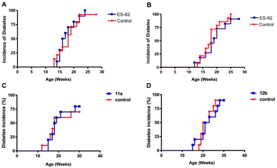 ES-62 and SMAs 11a and 12b do not protect against the development of type 1 diabetes. (A) Four-week-old female non-obese diabetic (NOD) mice were injected subcutaneously with 2 μg of ES-62 (n = 10) in 200 μL of sterile PBS once a week between four and 12 weeks of age. Control mice (n = 13) were injected with 200 μL of sterile PBS according to the same protocol. (B) 9–10 week-old female NOD mice were injected six times subcutaneously with sterile PBS (control) or 10 μg of ES-62 in sterile PBS over a two-week period (n = 9). Five-week-old female NOD mice received intraperitoneal injections of PBS (control) or 1 μg SMA 11a (C) or 12b (D) twice a week for 10 weeks (n = 10). The incidence of diabetes was monitored by regularly checking for the presence of glycosuria.