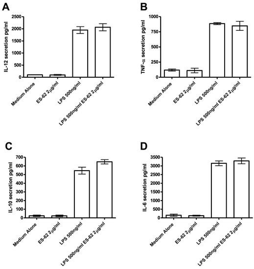 Effects of ES-62 on in vitro cytokine secretion by dendritic cells (DCs). DCs were prepared from bone marrow as described in the Materials and Methods. On day 10, they were harvested and incubated with medium alone, 500 ng/mL of LPS, 2 μg of ES-62 or with both 500 ng/mL of LPS and 2 μg of ES-62. At 72 h, supernatants were harvested and assayed for the presence of (A) IL-12p40, (B) TNF-α, (C) IL-10, and (D) IL-6. Data points correspond to the mean plus SEM of each set of samples.