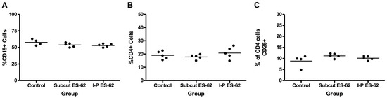 Effects of sub-cutaneous or intra-peritoneal treatment with ES-62 on composition of BDC2.5NOD splenocyte populations. Four-week-old BDC2.5NOD mice were given two injections of 2 μg ES-62 over the course of a week. After one week, splenocytes were harvested, and the percentage of B cells, CD4+ cells, and CD4+CD25+ cells was assessed by staining with (A) anti-CD19, (B) anti-CD4, and (C) anti-CD25, and subsequent FACS analysis. Each dot on the scatter plot corresponds to one individual mouse.