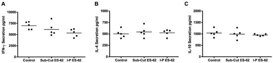 Effects of sub-cutaneous or intra-peritoneal treatment with ES-62 on the ex vivo response of BDC2.5NOD splenocytes to BDC2.5 peptide. Four-week-old BDC2.5NOD mice were given two injections of 2 μg ES-62 over the course of a week. After one week, splenocytes were harvested. Equal numbers of splenocytes from each group were re-stimulated with 1 mg/mL BDC2.5 peptide. Culture supernatants were harvested at 48 h and assessed for the presence of (A) IFN-γ, (B) IL-4, and (C) IL-10 by ELISA. Each dot on the scatter plot corresponds to the average cytokine secretion of splenocytes from one individual mouse.