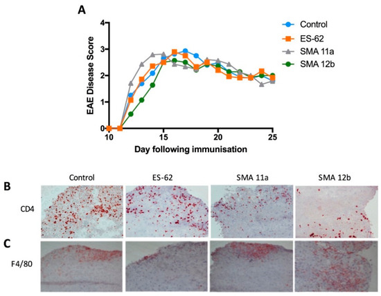 EAE was induced in mice as described in Materials and Methods. ES-62 and SMAs 11a and 12b were administered to C57BL/6 mice, but no effect was observed on EAE incidence or disease severity (Figure 5A). Immunohistochemical staining with antibodies against CD4 and F4/80 on spinal cord tissues was performed: there was a trend towards fewer infiltrating CD4+ cells when administering SMAs (particularly 12b; Figure 5B) but no differences in F4/80+ cells (Figure 5C) in the spinal cord between treatment groups. In addition, analysis of the IL-17 and IFN-γ levels in serum and in the conditioned medium of MOG35–55-stimulated spleen and lymph node cells was undertaken, but there were no significant differences in the levels of these two cytokines amongst any of the treatment groups (results not shown).
