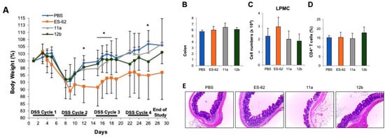 ES-62, and SMAs 11a and 12b do not prevent the induction of chronic colonic inflammation in the DSS-colitis model. (A) Body weight changes (as percentage of the initial weight) from the initiation of DSS-colitis was measured during four cycles of DSS with thrice weekly treatments of ES-62 or SMAs (11a or 12b). (B) Colon length (cm) was measured at cull. (C) Total cell counts and the proportion of CD4+ T cells (D) present in the lamina propria mononuclear cells (LPMC) were measured. (E) Representative Heamatoxylin and Eosin (H & E) staining of colons at time of sacrifice. Magnification = 100×. Data in (A–D) represent the means ± SD (n = 5) and statistical significance as determined by student’s t test (PBS versus ES-62) is denoted by * p < 0.05.