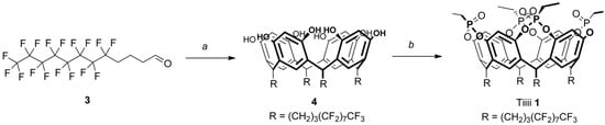 Unless stated otherwise, reactions were conducted in flame-dried glassware under an atmosphere of argon using anhydrous solvents (either freshly distilled or passed through activated alumina columns). All commercially obtained reagents were used as received unless otherwise specified. Silica column chromatography was performed using silica gel 60 (Fluka 230–400 mesh or Merck 70–230 mesh). NMR spectra were obtained using a Bruker AVANCE 400 (400 MHz) spectrometer at 298 K. 1H NMR chemical shifts (δ) were reported in ppm relative to the proton resonances resulting from incomplete deuteration of the NMR solvents. 19F NMR chemical shifts (δ) were reported in ppm relative to external CF3COOH. 31P NMR chemical shifts (δ) were reported in ppm relative to external 85% H3PO4. High-resolution MALDI-TOF was performed on an AB SCIEX MALDI TOF-TOF 4800 Plus (matrix: α-cyano-4-hydroxycinnamic acid). High resolution ESI-LTQ Orbitrap MS analyses were performed with a Linear Trap Quadrupole-Orbitrap mass spectrometer. 1H,1H,2H,2H,3H,3H-heptadecafluorododecanal (3) [28] and resorcinarene 6 [38] were prepared according to methods in the literature. The adopted nomenclature follows an established rule [13].