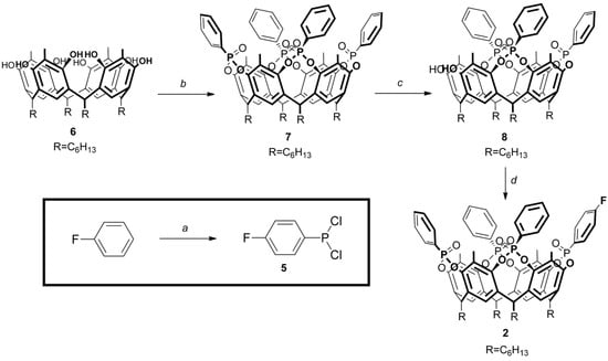 Synthesis of fluorinated tetraphosphonate cavitand 2: (a) (1) PCl3, AlCl3, 75 °C, 4 h; (2) POCl3, r.t., 0.5 h; (b) (1) PhPCl2, pyridine, 80 °C, 4 h; (2) H2O2, r.t, 0.5 h, 40% (over two steps); (c) 1 eq. 1,2-dihydroxybenzene, K2CO3, DMF, 80 °C, 5 h, 56%; (d) (1) 5, pyridine, 100 °C, 2 h; (2) H2O2, r.t, 0.5 h, 10% (over two steps).