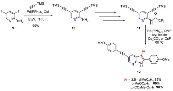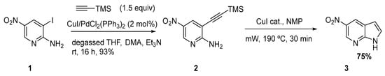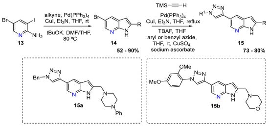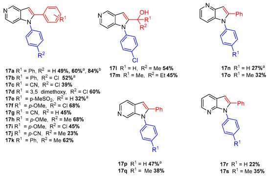 - Purificação, S.I.; Pires, M.J.D.; Rippel, R.; Santos, A.S.; Marques, M.M.B. One-Pot Synthesis of 1,2-Disubstituted 4-, 5-, 6-, and 7-Azaindoles from Amino- o -halopyridines via N-Arylation/Sonogashira/Cyclization Reaction. Org. Lett. 2017, 19, 5118–5121. [Google Scholar] [CrossRef] [PubMed]