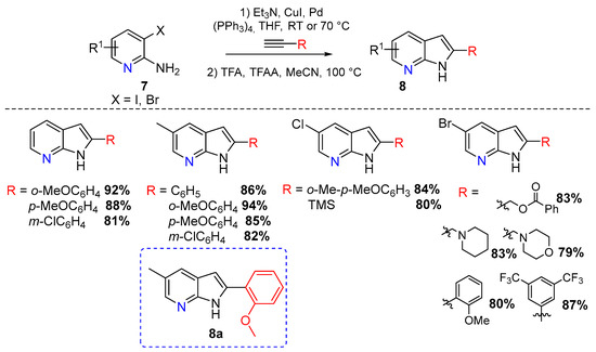 - Leboho, T.C.; Van Vuuren, S.F.; Michael, J.P.; De Koning, C.B. The acid-catalysed synthesis of 7-azaindoles from 3-alkynyl-2- aminopyridines and their antimicrobial activity. Org. Biomol. Chem. 2014, 12, 307–315. [Google Scholar] [CrossRef] [PubMed]