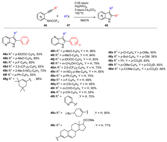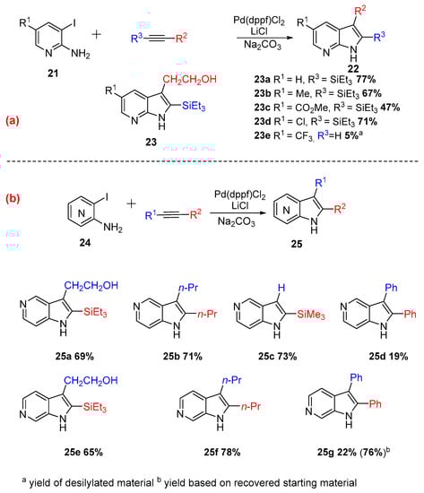 - Cacchi, S.; Fabrizi, G.; Parisi, L.M. The aminopalladation-reductive elimination process as a tool for the solution-phase synthesis of 2,3-disubstituted azaindole libraries. J. Comb. Chem. 2005, 7, 510–512. [Google Scholar] [CrossRef] [PubMed]