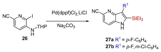 - Park, S.S.; Choi, J.K.; Yum, E.K.; Ha, D.C. A facile synthesis of 2,3-disubstituted pyrrolo[2,3-b]pyridines via palladium-catalyzed heteroannulation with internal alkynes. Tetrahedron Lett. 1998, 39, 627–630. [Google Scholar] [CrossRef]