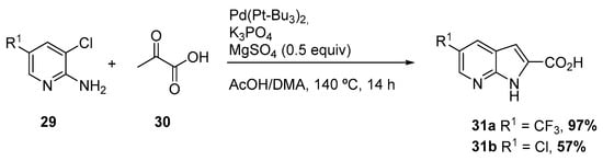 Chicago/Turabian StyleSantos, A. Sofia, Ana C. Mortinho, and M. Manuel B. Marques. 2018. "Metal-Catalyzed Cross-Coupling Reactions on Azaindole Synthesis and Functionalization" Molecules 23, no. 10: 2673. https://doi.org/10.3390/molecules23102673