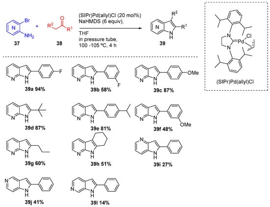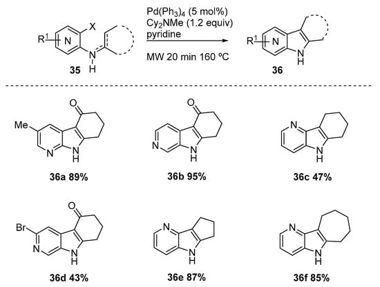 - Nazaré, M.; Schneider, C.; Lindenschmidt, A.; Will, D.W. A flexible, palladium-catalyzed indole and azaindole synthesis by direct annulation of chloroanilines and chloroaminopyridines with ketones. Angew. Chem. Int. Ed. 2004, 43, 4526–4528. [Google Scholar] [CrossRef] [PubMed]