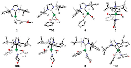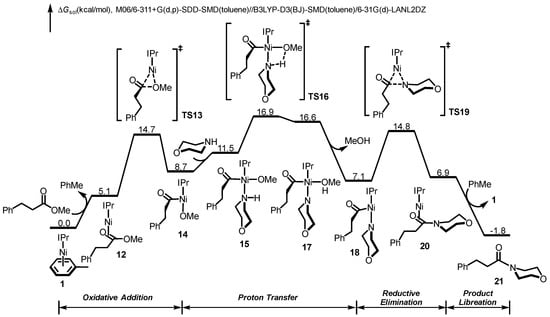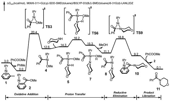Using methyl benzoate and morpholine as the model substrates, we first explored the free energy changes of Ni/IPr-catalyzed amidation with aromatic ester. The free energy profile is shown in Figure 1, and the optimized structures of selected species in the catalytic cycle are shown in Figure 2. From the Ni(IPr)(toluene) complex 1 [67], the initial ligand exchange with substrate is exergonic and leads to the substrate-coordinated complex 2. Subsequent oxidative addition via TS3 requires a barrier of 20.4 kcal/mol, which generates the acylnickel species 4. 5 then undergoes a facile inner-sphere proton transfer through TS6, and the dissociation of methanol leads to the LNiII(acyl)(amino) intermediate 8. From 8, the C–N bond formation occurs via the reductive elimination transition state TS9, and the final exergonic product liberation produces the amidation product 11 as well as regenerates the catalytically active species 2. We have confirmed the stability of wavefunctions for all Ni(II) species involved in the catalytic cycle. We were not able to locate the transition states for the ligand exchange steps (4 to 5, 7 to 8) due to the flat energy surface. A series of constrained optimizations were performed to verify the flat energy surface of ligand exchange. Details are included in Supplementary Materials (Figure S1). Based on the DFT-computed free energy changes of the overall catalytic cycle, the on-cycle resting state is the substrate-coordinated complex 2, and the rate-limiting step is the C–O bond activation step via TS3 with an overall barrier of 20.4 kcal/mol. Our computations also suggested that the overall amidation is reversible and almost thermodynamic neutral. The reaction barrier for the reversed transformation from 11 to 2 is only 20.3 kcal/mol. This corresponds well with the reversible nature of this amidation transformation, as reported by Newman [54]. It should be pointed out the generated methanol may leave the reaction system due to its volatility, which serves as an additional driving force for the amide formation.