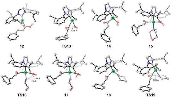 Optimized structures of selected intermediates and transition states in the catalytic cycle of Ni/IPr-catalyzed amidation of ester.
