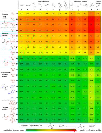 Based on the computed free energy profiles of Ni-catalyzed amidation of ester, we noticed that the major bottleneck for this type of transformation is the control of thermodynamics. The thermodynamic equilibrium has to be designed cautiously because the overall transformation does not have a strong force, unlike many other organic transformations. Therefore, the synthetic efforts could be unfruitful even the designed amidation or esterification has a surmountable reaction barrier. In order to understand the controlling factors of the thermodynamic equilibrium of amidation as well as provide a general thermodynamic guideline for related reaction designs, we computed the free energy changes with a series of esters and amides. The results are summarized as a heat map in Figure 5. Green represents the thermodynamic equilibrium that favors the formation of ester, and red indicates the opposite trend.