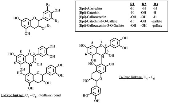 Proanthocyanidins, or condensed tannins, are plant secondary metabolites produced by the polymerization of flavan-3-ol monomers. The monomer units are produced in the plant cell chloroplast but condensed in specialized chloroplast derived organelles termed tannosomes [1]. Proanthocyanidins are compositionally and structurally complex due to a variety of possible subunits and interflavan bond locations. Figure 1 displays the basic structure of a flavan-3-ol monomer with two illustrated interflavonoid linkages of single (B-type) linkage with either 4–8 or 4–6 bonds.
