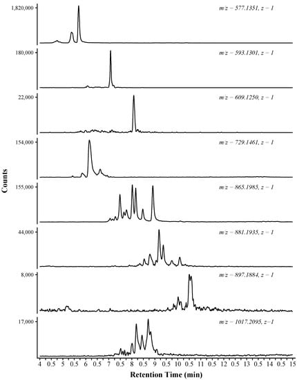 Each extracted ion chromatogram trace is labeled with the detected m/z and corresponding charge (Figure 2). The first four panels were tentatively identified as dimeric proanthocyanidins, with the first panel showing the extracted ion chromatograms at m/z 577.1351. This extracted mass was identified as having a chemical formula of C30H26O12, a dimer comprised of catechin and epicatechin subunits. Multiple peaks are shown in the extracted ion chromatograms, with retention times of 4.68, 4.72, 5.31, and 5.63 min. Each peak corresponds to an isomer of C30H26O12. In total, four possible dimeric compounds exist, comprised of catechin and epicatechin units. In the presented example, the four peaks are shown, but two peaks are closely retained (4.68 and 4.72 min). Due to the chemical isomorphism, these similarly retained compounds are likely catechin-epicatechin and epicatechin-catechin dimers.