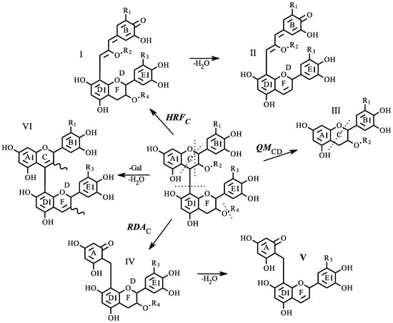 Characteristic proanthocyanidin fragmentation pathways. Three primary fragmentation mechanisms are shown: Heterocyclic Ring Fission (HRF), quinone methide fission (QM), and retro Diels-Alder (RDA); subscripts C or CD indicate the fragmentation location in the rings of the subunit; each yield structures I, III, and IV, as indicated. Further losses of water and gallate (II, V, VI) are also indicated. For each structure; R1 = R3 = OH, H: R2 = R4 = H, Gallate.