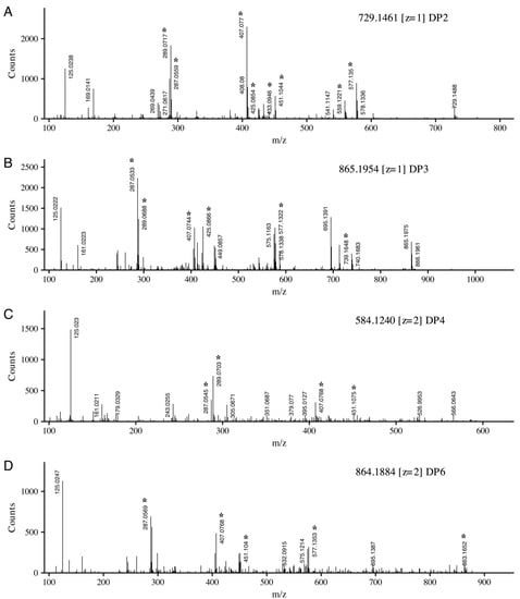 Negative ion electrospray ionization (ESI) tandem mass spectra of four representative proanthocyanidins. Precursor ion and charge are indicated. Diagnostic ions associated with cleavage patterns described in Figure 3 are indicated with *. Degree of polymerization (DP).