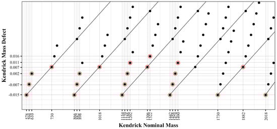 Kendrick mass analysis was applied to visualize the specific identified compounds. The presented approach uses the simple (epi)catechin extension unit (C15H12O6) as the basis of the Kendrick mass scale, and information can be obtained regarding subunit composition. This was done by first plotting the Kendrick Mass Defect (KMD), Equation (2), against the Kendrick Nominal Mass (KNM), Equation (1), for each compound. Figure 5 displays each of the theoretical polymers as solid black dots, along with red circles indicating a putatively identified compound found in the wine samples. The x- and y-axes are labeled with the KNM and KMD for the identified compounds. This visualization allows one to quickly determine which polymers are present in a sample. The diagonal lines divide the graph by degree of polymerization, e.g., the nine points in the far-left diagonal lane of the plot are the nine possible dimers. The next lane to the right shows the trimers. Evaluating the KNM of 866, the simple catechin-catechin-catechin trimer is positioned with a defect of −0.015. This defect is characteristic of a polymer comprised of catechin repeats and is also shown by the catechin tetramer (1154 KNM), pentamer (1442 KNM), and the hexamer (1730 KNM) as each are plotted with an equivalent −0.015 mass defect.