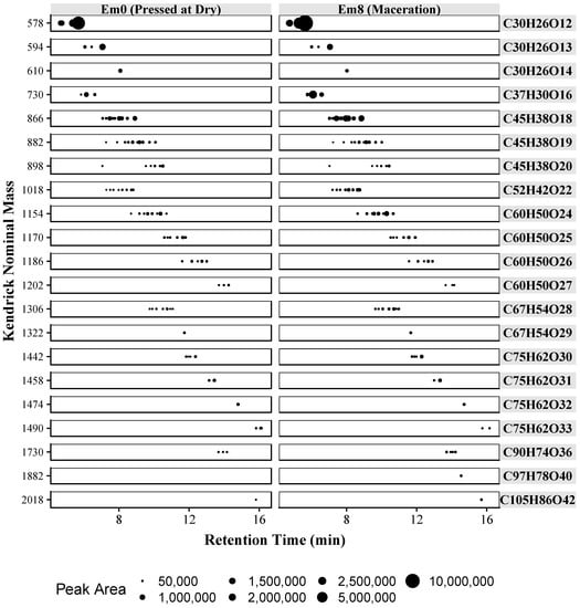 In addition to Kendrick mass, chromatographic peak areas can be used to evaluate relative treatment effects. In Figure 6 each tentatively identified compound, by KNM, is plotted against retention time, with each point scaled to the absolute peak area. Twenty-one different formulas are shown, with a total of 89 tentatively identified compounds. By plotting the KNM and cross referencing to Figure 5 it is possible to determine the composition of a given polymer. Overall, Figure 6 provides a rapid visualization of the relative difference between the two samples. On visual inspection, the catechin/epicatechin dimer at KNM of 577 is the most abundant in each sample. In general, the sample with extended maceration (Em8) shows a higher concentration of each polymer. In comparing the two samples, longer skin contact (Em8) also resulted in higher concentrations of galloylated polymers, as demonstrated by comparing the relative peak areas of compounds with KNM 730 and 1018. An overall trend showing increased extraction of proanthocyanidins with maceration is shown. Both the increase in smaller DP proanthocyanidins and the greater abundance of galloylated proanthocyanidins suggests increased proanthocyanidin extraction from the seeds. Prior research has shown that seed proanthocyanidins have smaller DPs and are more highly galloylated than skin derived proanthocyanidins [33]. Similar findings regarding increased seed extraction have been reported for Merlot wines, in which an increase of approximately 73% in seed extraction was observed with a 30 days extended maceration [34].
