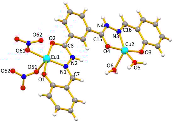 Compound 2 can be considered as a dimer of 1, where dimerization took place at the level of the metals bearing nitrates, leading to a central four-membered dicopper metalacycle. This process affected not only the dimensions involving the central copper cations (Cu(nitrate), see Table 2), but also the outer ones with water ligands bound to copper (Cu(water), see Table 2), which is probably related to the observed change of geometry (see above the values of τ5 descriptor for such metals). Thus, from 1 to 2, the Cu-Ophenolate increased in both types of metals, but the Cu-Oketone increased only in the metal with water ligands, and decreased slightly in the other. Concerning the Cu-Owater lengths, they differ markedly in 2 with the apical much longer than the equatorial one; in 1 the dissimilarity is not so significant, but still the longer distance pertains to the water molecule more distant from the least-square plane of the molecule. An influence has also been perceived in the Cu···Cu lengths; in the molecule of 2 the distance between the Cu(nitrate) and the Cu(water) is more than 0.100 Å shorter than in 1, but the shortest intermolecular distance between the metal cations is higher in the former. The effect on selected O-Cu-O and O-Cu-N angles in 1 and 2 (Table 2) is most probably related to the aforementioned differences in geometry.