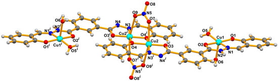 Synthesis of [Cu2(1κNO2:2κN′O2-H2L)(NO3)2(H2O)2] (1): 0.402 g (1.0 mmol) of H4L was suspended in 25 mL of methanol and 0.525 g Cu(NO3)2·5H2O (2.05 mmol) were added. The resultant mixture was stirred at room temperature for 15 min; a dark green solution was obtained. The solution was then filtered and the solvent was allowed to evaporate slowly. After 3–4 days, single crystals suitable for X-ray diffraction were isolated, washed 3 times with cold methanol and dried in open air.