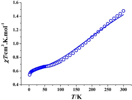 Plot of χMT versus T for complex 2. The solid line represents the best theoretical fitting.