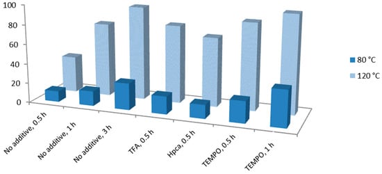 Attempts to perform microwave-assisted oxidation of secondary alcohols in the presence of 1 or 2, in the absence of any additive and at room temperature, failed. Performing the reaction at 80 °C did not allow yields beyond 27% in 3 h (with catalyst 1), but at 120 °C the product was obtained in 95 (with 1) or 71% yield (with 2), in the same reaction time (Table 3, entries 5 and 20). The accelerating effect of the increase in temperature was also observed in the presence of the tested additives (Figure 4). Thus, for example, in the presence of the TEMPO radical, one observes a change in the conversion of 1-phenylethanol from 22 to 88% and in the TOF value from 168 to 1112 h−1 (Table 3, entries 12 and 13) when going from 80 or 120 °C, in 0.5 h. This feature also concerns the microwave power since at 80 °C the power went up to 10 W in the first 10 s but then, after reaching the desired temperature, it stabilized at ca. 5 W, while for the temperature of 120 °C, ca. 40 W were reached in the first 10 s followed by stabilisation at 10–15 W for the remaining time.