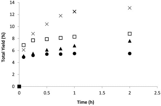 Total yield (cyclohexanol and cyclohexanone) along the time in the oxidation of cyclohexane with aq. H2O2 catalyzed by 1 in the absence of any additive (□, squares) or in the presence of TFA (1:10) (×, cross), or by 2 in the absence of any additive (●, circles) or in the presence of TFA (1:10) (▲, triangles), at 50 °C in CH3CN.