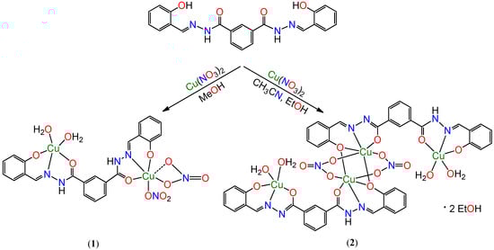 The aroylhydrazone Schiff base bis(2-hydroxybenzylidene) isophthalohydrazide (H4L) has two potential tridentate coordination pockets which can bind two metal centres simultaneously. It has previously been observed [32,33,34] that the aroylhydrazone can act as ligand in two tautomeric (keto or enol) forms. At room temperature, deprotonation of the phenolic –OH group from the aroylhydrazone in the presence of a copper (II) source, in methanol, generates the H2L2− species and leads to the stable dinuclear complex 1 (Scheme 1). When the reaction is carried out in a 2:1 acetonitrile-ethanol solvent mixture, part of the aroylhydrazone remains in the keto form, the remaining undergoing enolization and deprotonation during complexation. As a result, a HL3− species is formed in solution and provides the tetranuclear complex 2 (Scheme 1). This compound 2 can be considered as a dimer of 1, where the two central Cu (II) ions are bridged by two nitrate ions and one of the phenoxido groups of the organic ligand. The IR spectra of complexes 1 and 2 contain all the characteristic bands of the corresponding coordinated tridentate anionic ligand viz., 3476, 3024, 1608, 1254 and 1159 cm−1 for 1 and 3388, 3226, 2978, 1611, 1252 and 1068 cm−1 for 2. The electrospray ionization mass spectrometry (ESI-MS) spectra of both compounds, in ethanol solution (see experimental section), display the molecular ion peaks at m/z = 672 [1 + H]+ (100%) and at m/z = 1158 [2 + H]+ (100%).