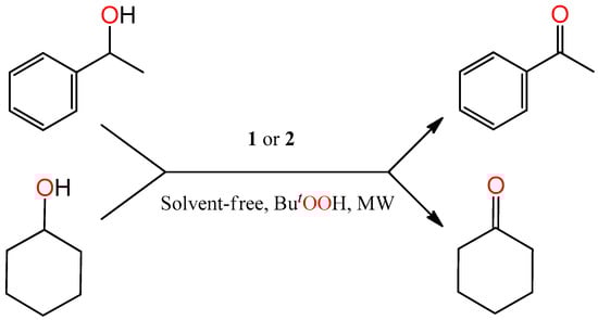 Complexes 1 and 2 were tested as catalyst precursors for the homogeneous oxidation of secondary alcohols [1-phenylethanol (model substrate), cyclohexanol, 2-hexanol and 3-hexanol] to the corresponding ketones following our previously developed procedure [18,31,36,37,38,39] using tert-butylhydroperoxide (t-BuOOH, Equation (2), used as aq. 70%) as oxidizing agent, under typical conditions of 80–120 °C, microwave (MW) irradiation (5–20 W), 0.5–3 h reaction time and in the absence of any added solvent (Scheme 2 for 1-phenylethanol and cyclohexanol oxidation). Results are summarized in Table 3 and Table 4.