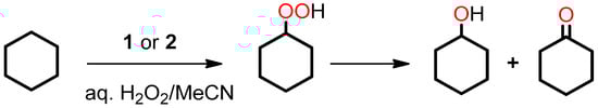 Compounds 1 and 2 were also tested as catalyst precursors in the oxidation of cyclohexane by H2O2 (Equation (2), used as 50% aqueous solution) at 50 °C in MeCN/H2O medium (Scheme 3). The reaction was monitored by Gas Chromatography (GC) to determine the amount of cyclohexanol and cyclohexanone formed, typically after treatment with PPh3 (to reduce cyclohexyl hydroperoxide to cyclohexanol) [29,30,49,50,51].
